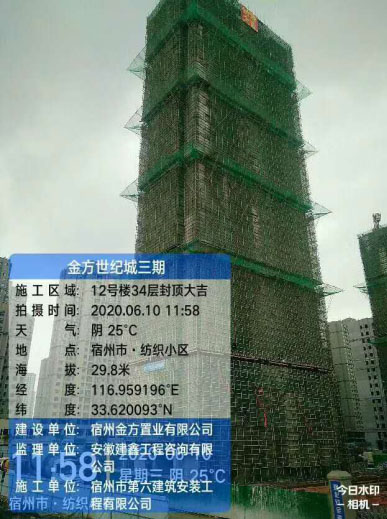 購機客戶項目介紹:宿州市第六建筑安裝工程有限公司負責施工的安徽宿州金方置業(yè)有限公司12號樓34層封頂大吉。