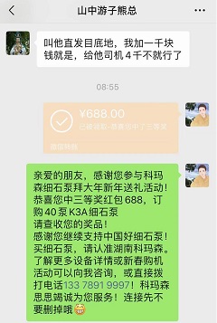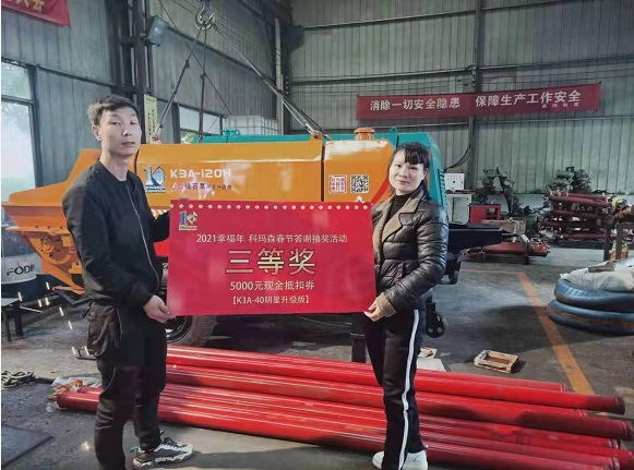 恭喜青海熊總在科瑪森新年特惠購(gòu)機(jī)活動(dòng)中榮獲三等獎(jiǎng)(現(xiàn)金688元+購(gòu)機(jī)現(xiàn)金抵扣券5000元),喜提科瑪森40泵明星升級(jí)版K3A-120H一臺(tái)。
