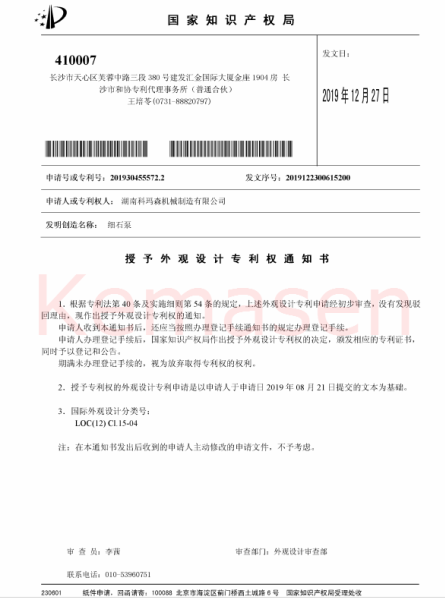 湖南科瑪森機(jī)械制造有限公司于近日取得外觀設(shè)計(jì)專利證書,專利名稱為:細(xì)石泵,專利號(hào)為201930455572.2