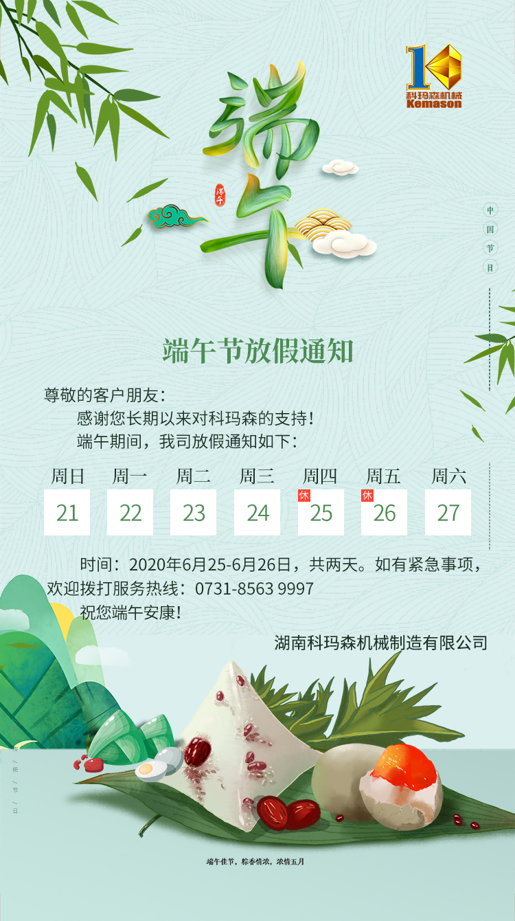 值此端午節(jié),科瑪森除了對各位朋友們、客戶們致以端午問候與祝福:“端午節(jié)安康”。更是勉勵科瑪森全體同仁發(fā)揚優(yōu)良傳統(tǒng)文化:熱愛祖國、熱愛生活、熱愛工作,努力學習,致力做“中國好細石泵”事業(yè),讓天下人都買到好細石泵,輕松做工程,快樂掙大錢 !