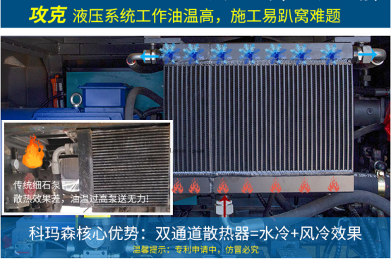 4、實現(xiàn)對液壓系統(tǒng)兩個液壓回路獨立散熱,把川崎泵高溫回路獨立分開散熱,專門為細石泵川崎液壓回路定制設(shè)計,科瑪森細石泵散熱技術(shù) 同行業(yè)(說明:1個雙通道散熱器=1個普通風(fēng)冷散熱器+1個水冷效果);